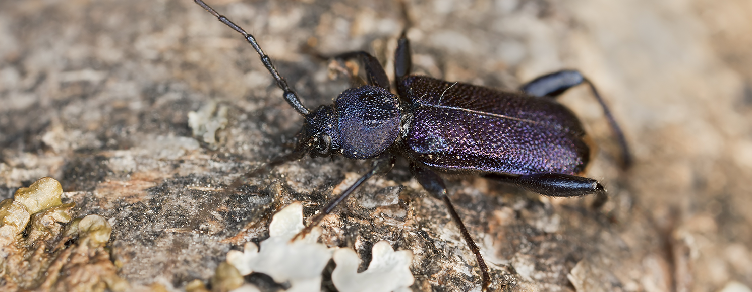 Blåbukk (Callidium Violaceum) inngår i familien trebukker. Disse kjennes igjen på de lange antennene.
